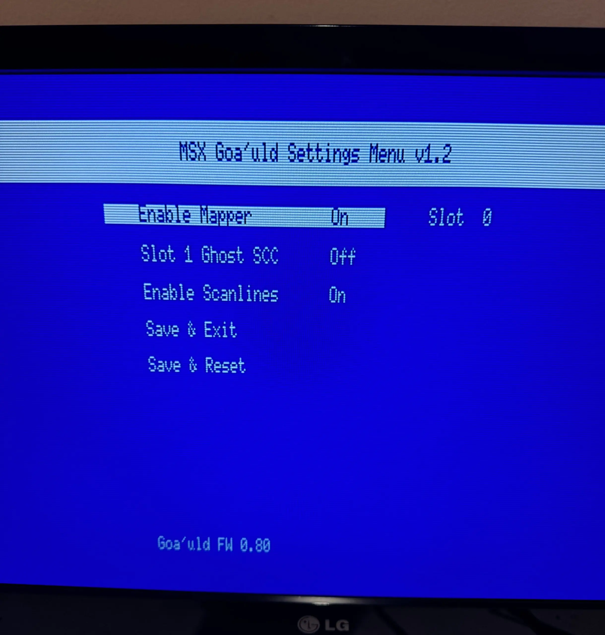 El firmware integra un menú de configuración que se muestra al mantener pulsada la tecla g durante el logotipo de arranque del MSX.